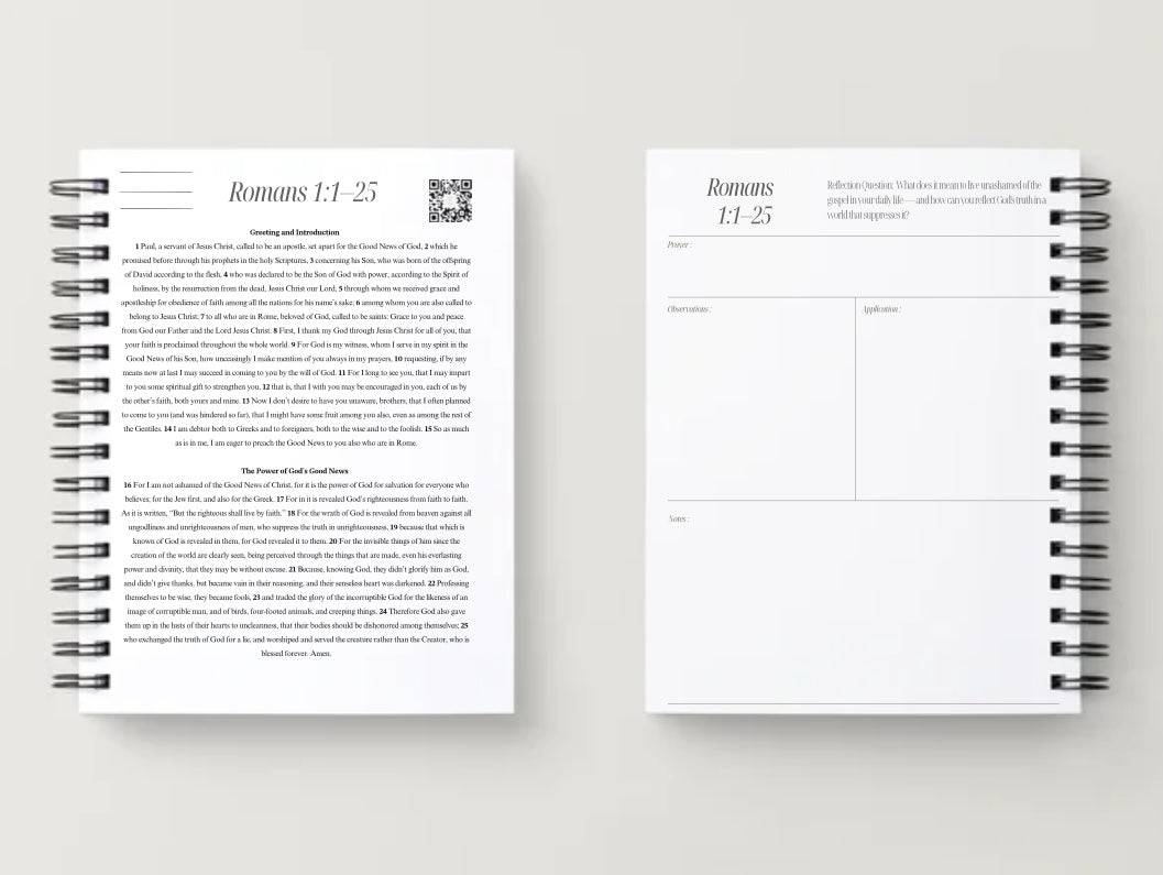Reflection Bible Volume 3 takes you through Acts and Paul’s letters through Philemon, providing space to reflect on the story of the early church and apostolic teaching. The left-hand page presents the full Scripture passage, while the right-hand page invites prayer, notes, and application through guided prompts. QR codes unlock digital tools with summaries, applications, and quizzes, making study both practical and interactive.