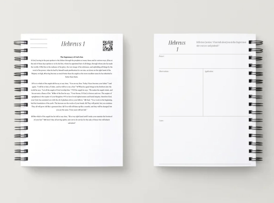 Reflection Bible Volume 4 completes the New Testament with Hebrews through Revelation. Each left-hand page contains the full passage of Scripture, and each right-hand page offers journaling space with prompts to reflect, pray, and apply God’s Word. QR codes link to digital tools designed to help you grow in understanding and faith.